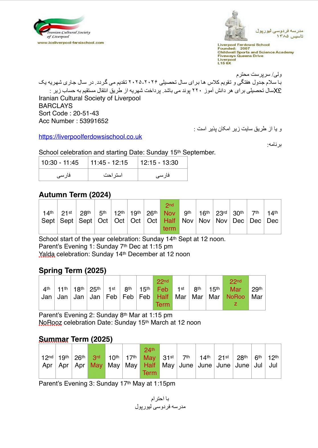 مدرسه فارسی لیورپول درسال ۲۰۰۶ میلادی با همت جمعی از ایرانیان داوطلب علاقه مند به فرهنگ و زبان پارسی تاسیس گردید .با گذشت زمان ، فعالیت های مدرسه، گسترش بیشتری یافت و نام زنده کننده زبان پارسی (فردوسی) را برگزید.